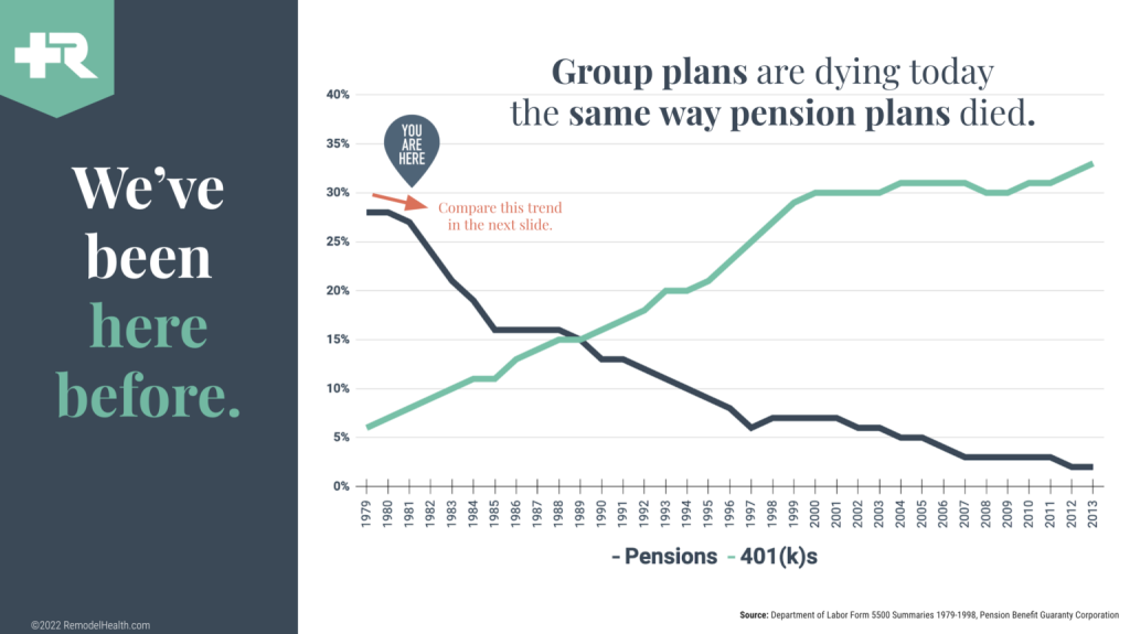 This question was actually asked back in the 1980s about group retirement benefits, too. Employees all used to be given a pension plan in a similar “one-size-never-fits-all” approach. Then as time passed and new solutions were developed, group retirement benefits (pension plans) were very quickly replaced by individual retirement benefits—otherwise known as 401(k)s!