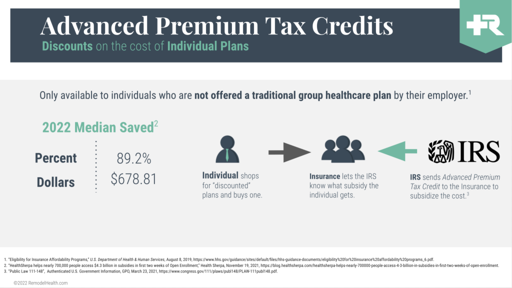 Not only can individual plans meet all those individual needs, they also unlock something called Advanced Premium Tax Credits. These are, quite simply, a discount on the individual plan. Do you know what this practically means? It means that if you have a traditional group plan, you are paying full price.