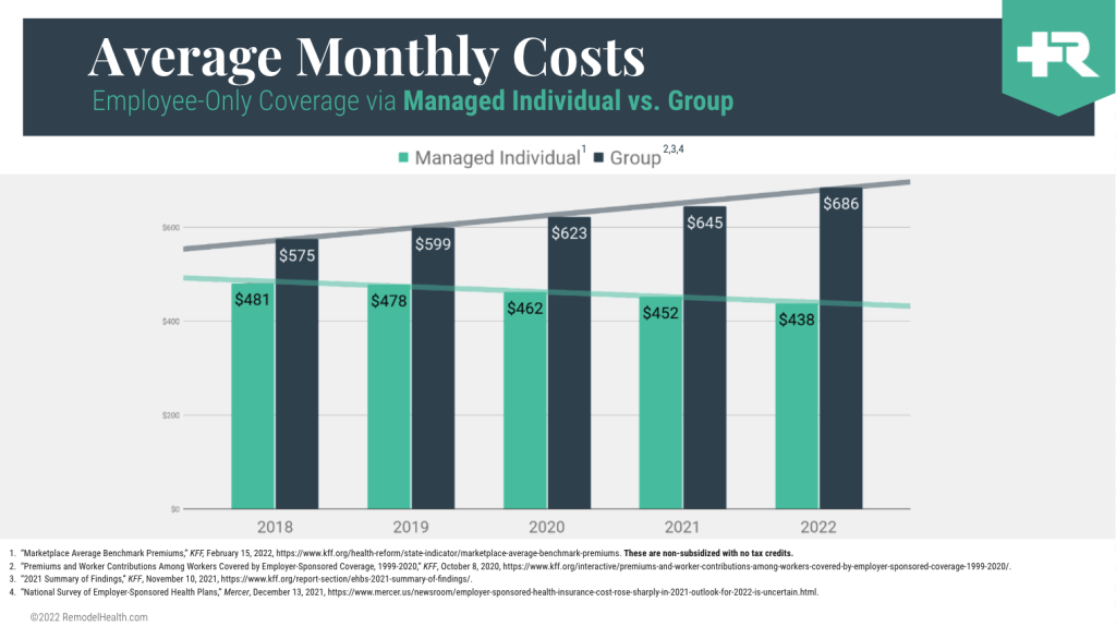 This data over the past five years shows an incredible trend when we compared traditional group coverage for an employee-only plan against the relative cost of individual insurance for an employee-only plan. This is an apples-to-apples comparison of group plans vs. individual insurance—and the price keeps going down! Which is a win-win for both employers and employees!