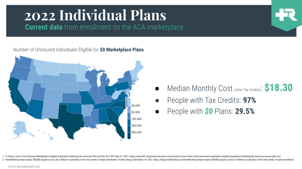 These discounts matter because of how big they really are. For the latest 2022 individual insurance plan enrollees, the median monthly cost was $18.30. Yes, you read that number right! This is possible because tax credits are available to 97% of people! And yes, the discounts are in addition to the individual plans already being cheaper.