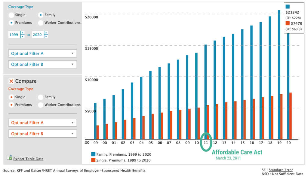 This is two decades of data showing unsustainable increases in the cost of health benefits. Even after the Affordable Care Act arrived in 2011, nothing has really changed with average group plan prices. They continue to go up!